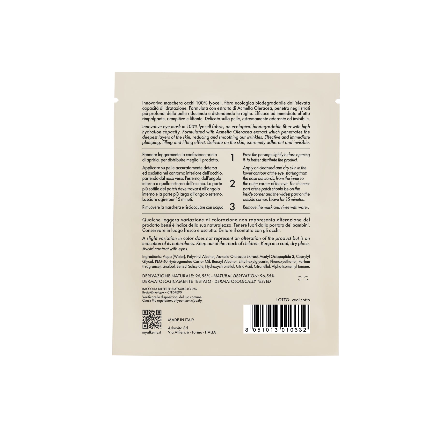 Innovative eye mask in 100% lyocell, an ecological biodegradable fiber with high hydration capacity. Formulated with Acmella Oleracea extract which penetrates the deepest layers of the skin, reducing and smoothing out wrinkles.